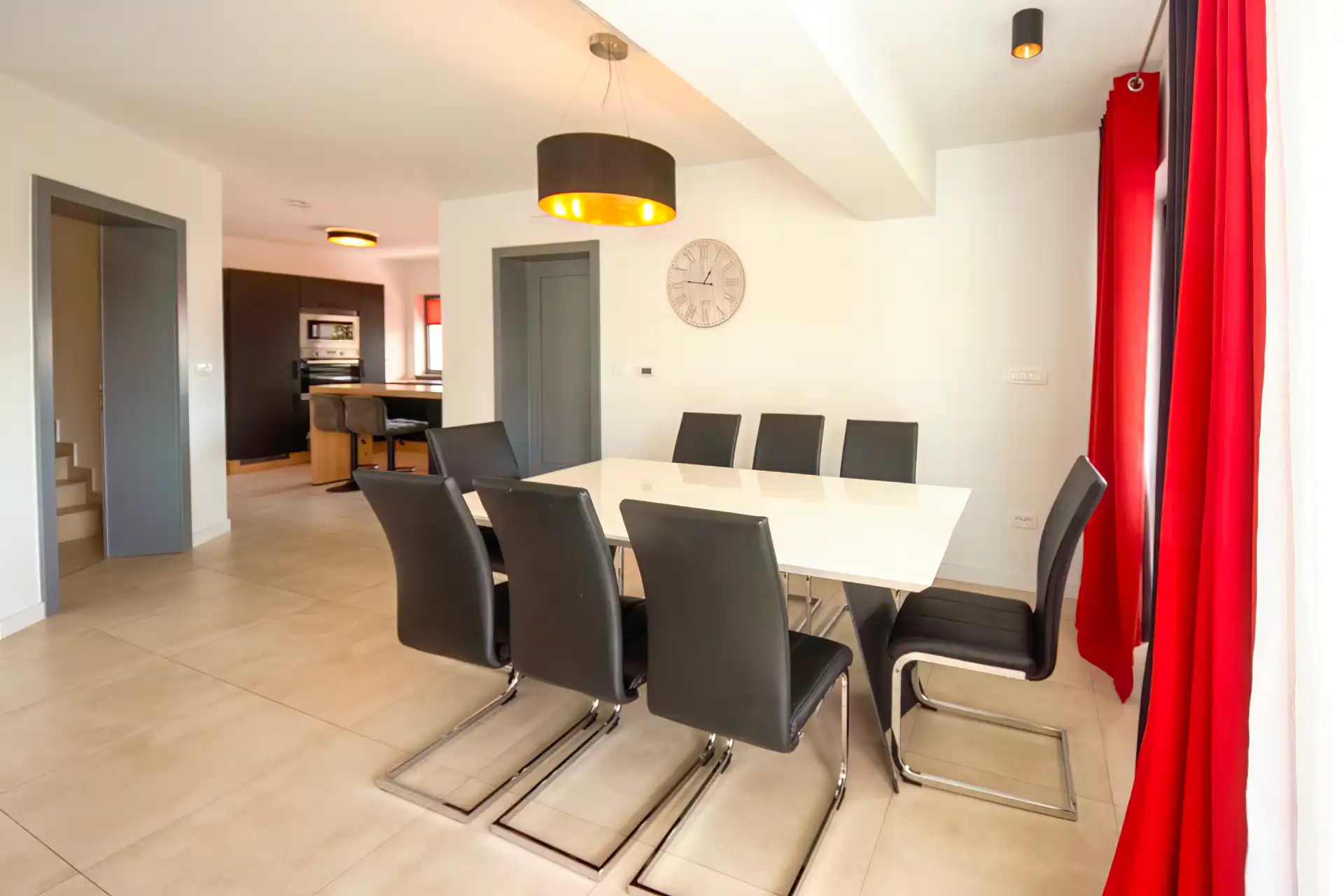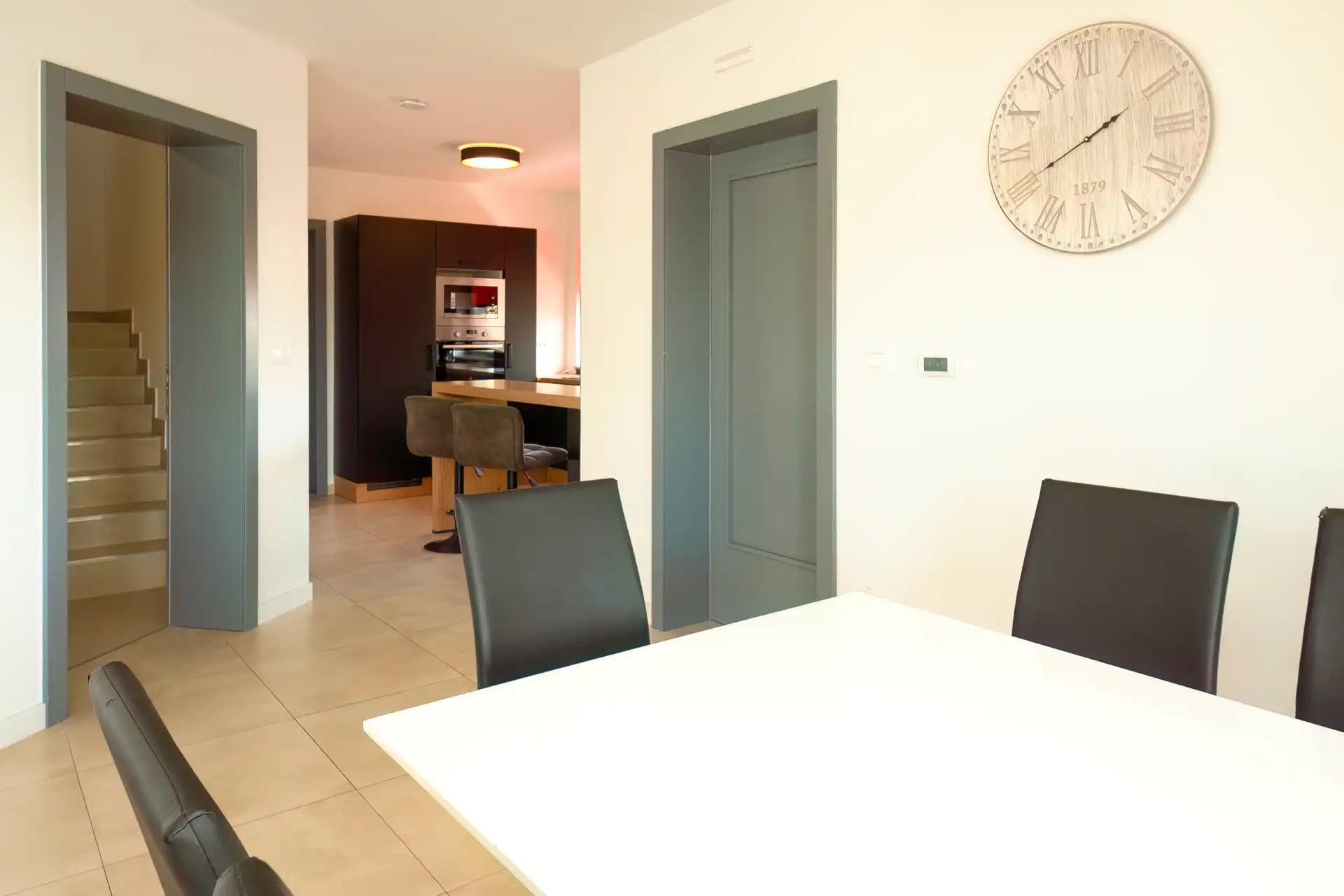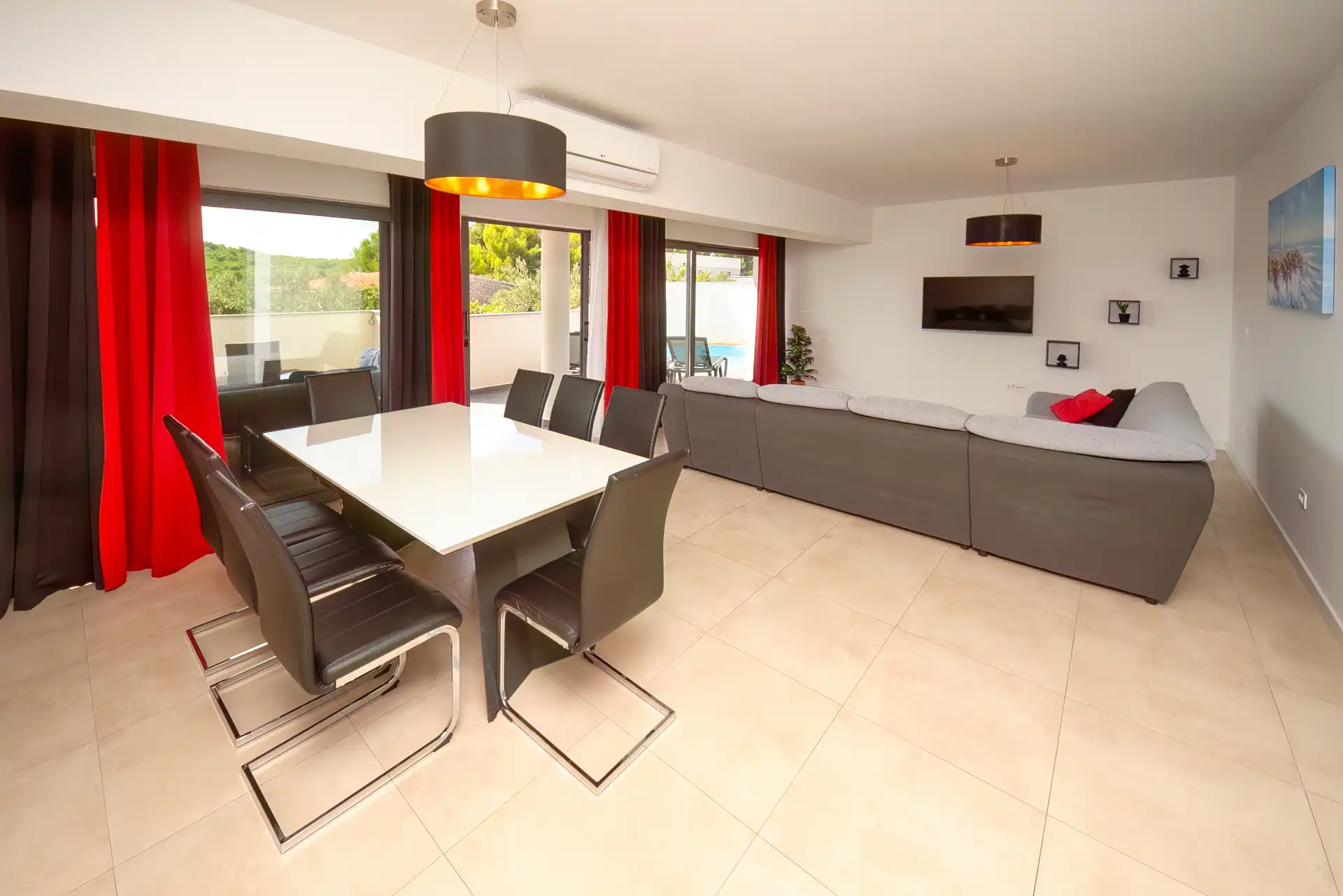 Das 45 m² große Wohn-/Esszimmer fungiert als Herzstück des Ferienhauses mit Pool. Die Südostausrichtung sorgt für optimale Lichtverhältnisse, während die Klimaanlage auch an heißen Sommertagen angenehme Temperaturen gewährleistet.