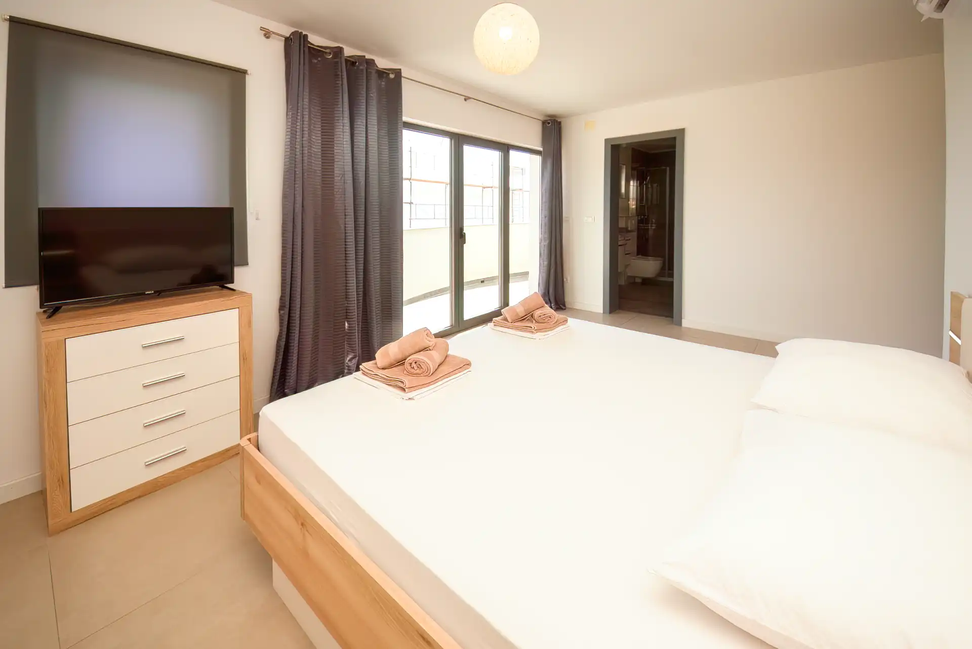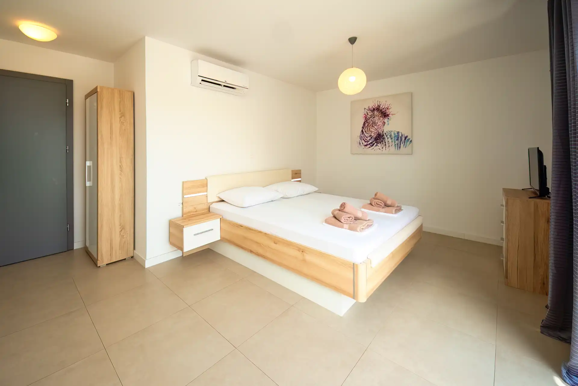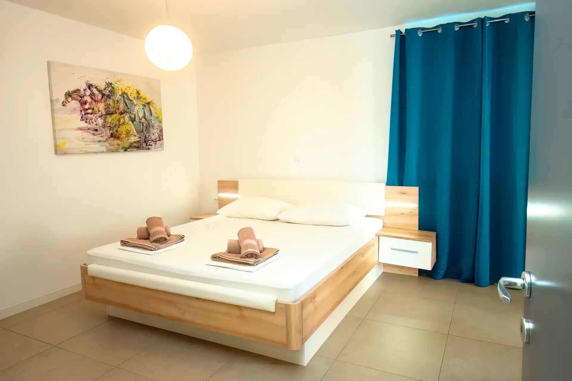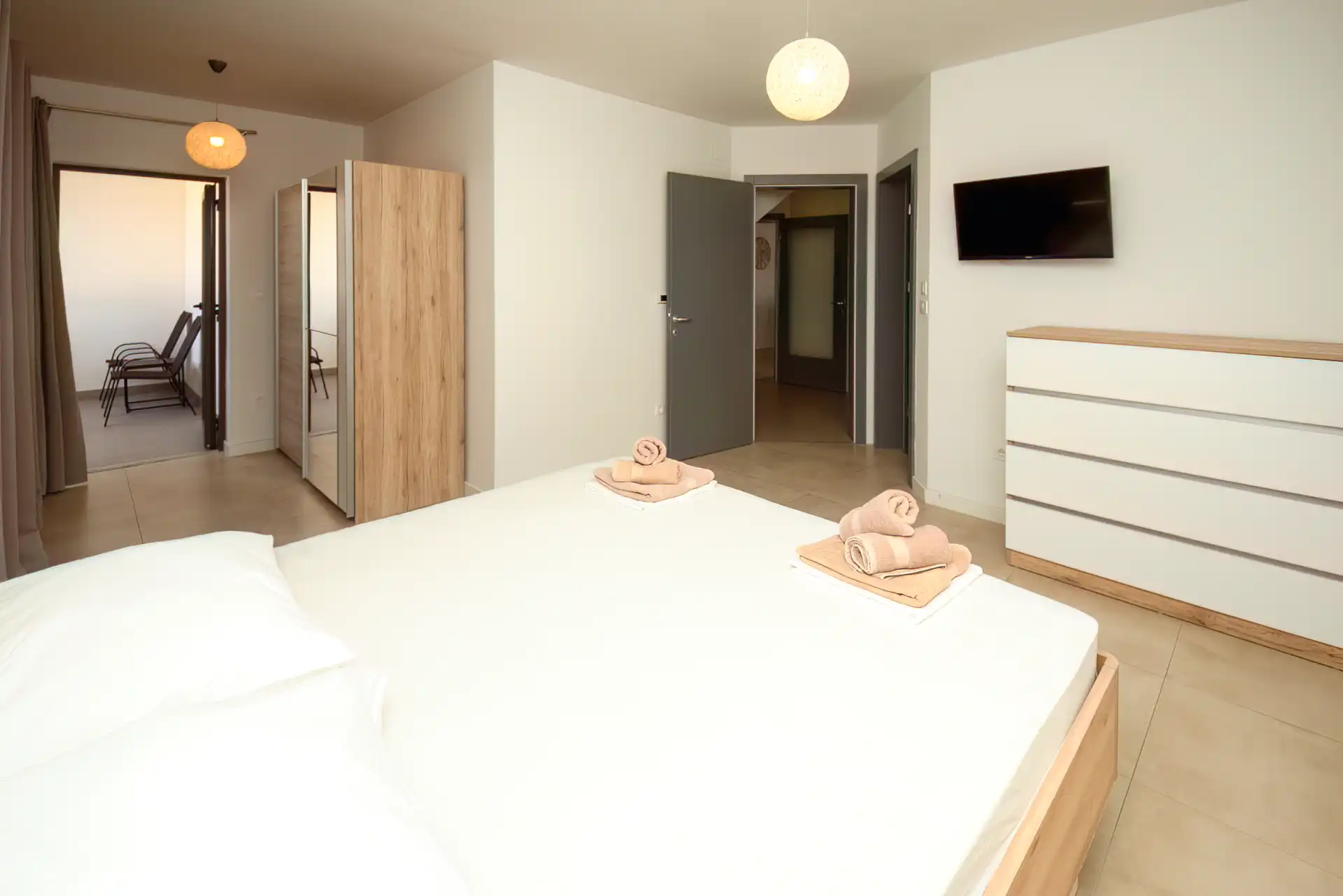 Drei identisch ausgestattete 20 m² Schlafzimmer mit jeweils eigenem Bad schaffen private Bereiche für Familienmitglieder oder Freundesgruppen. Jedes Zimmer verfügt über französische Betten (180×200 cm) und individuelle Klimasteuerung.