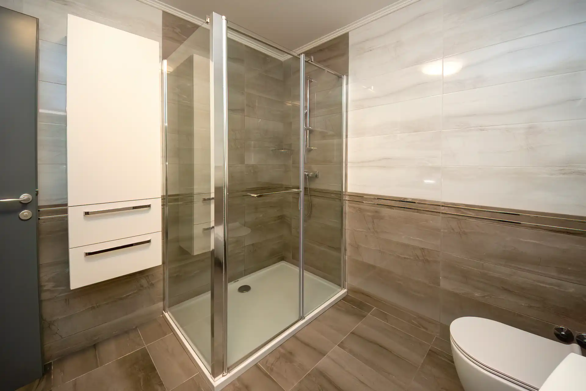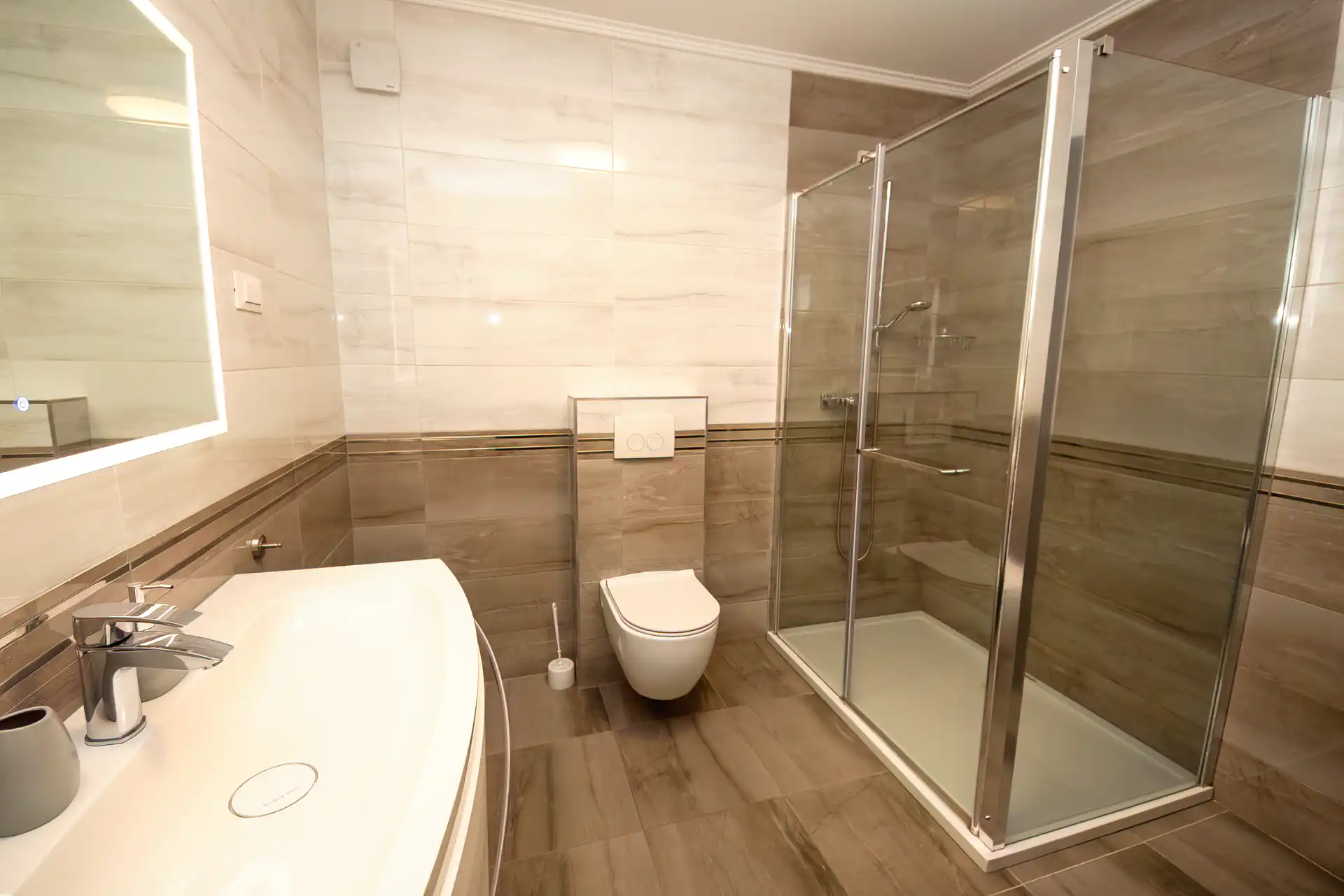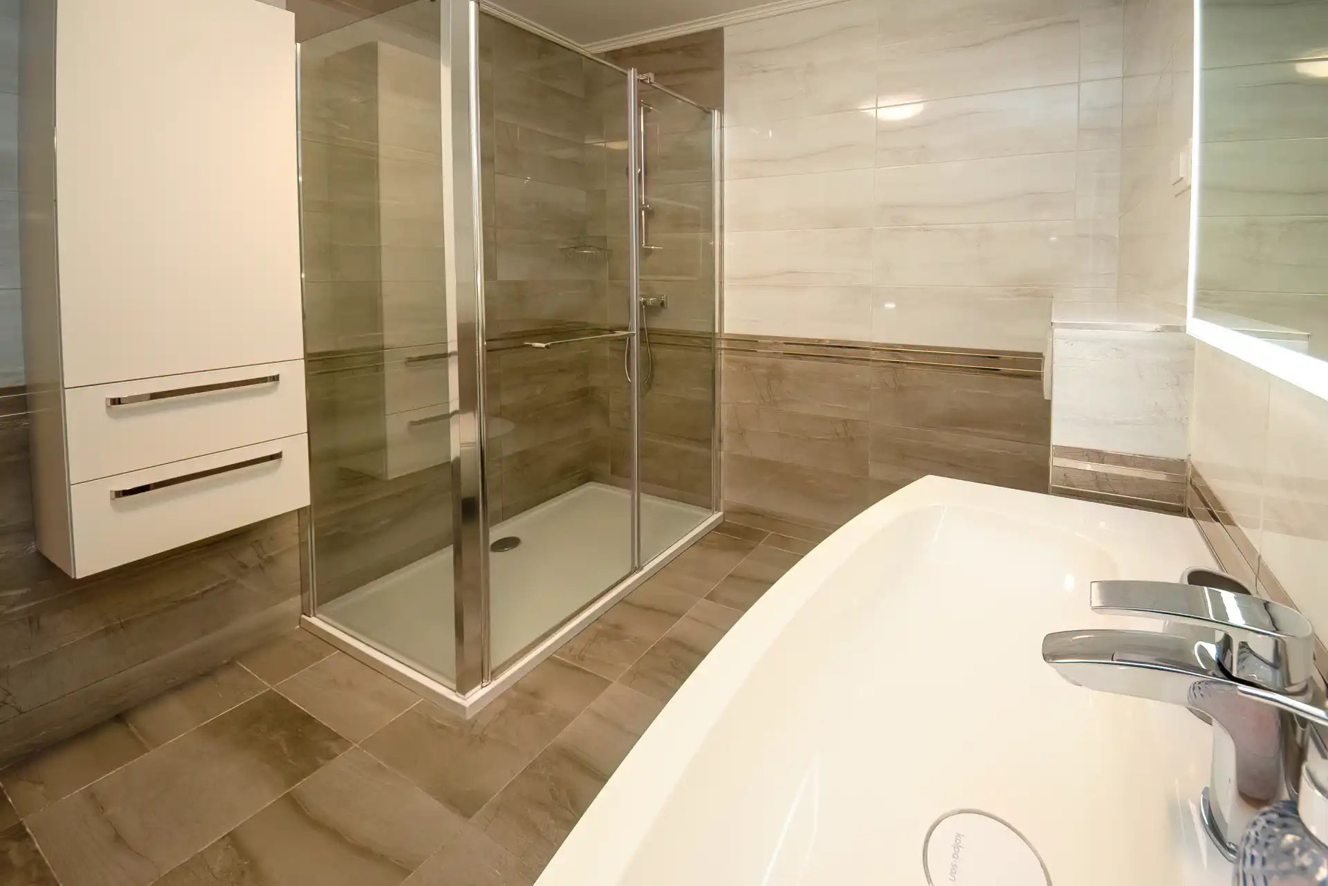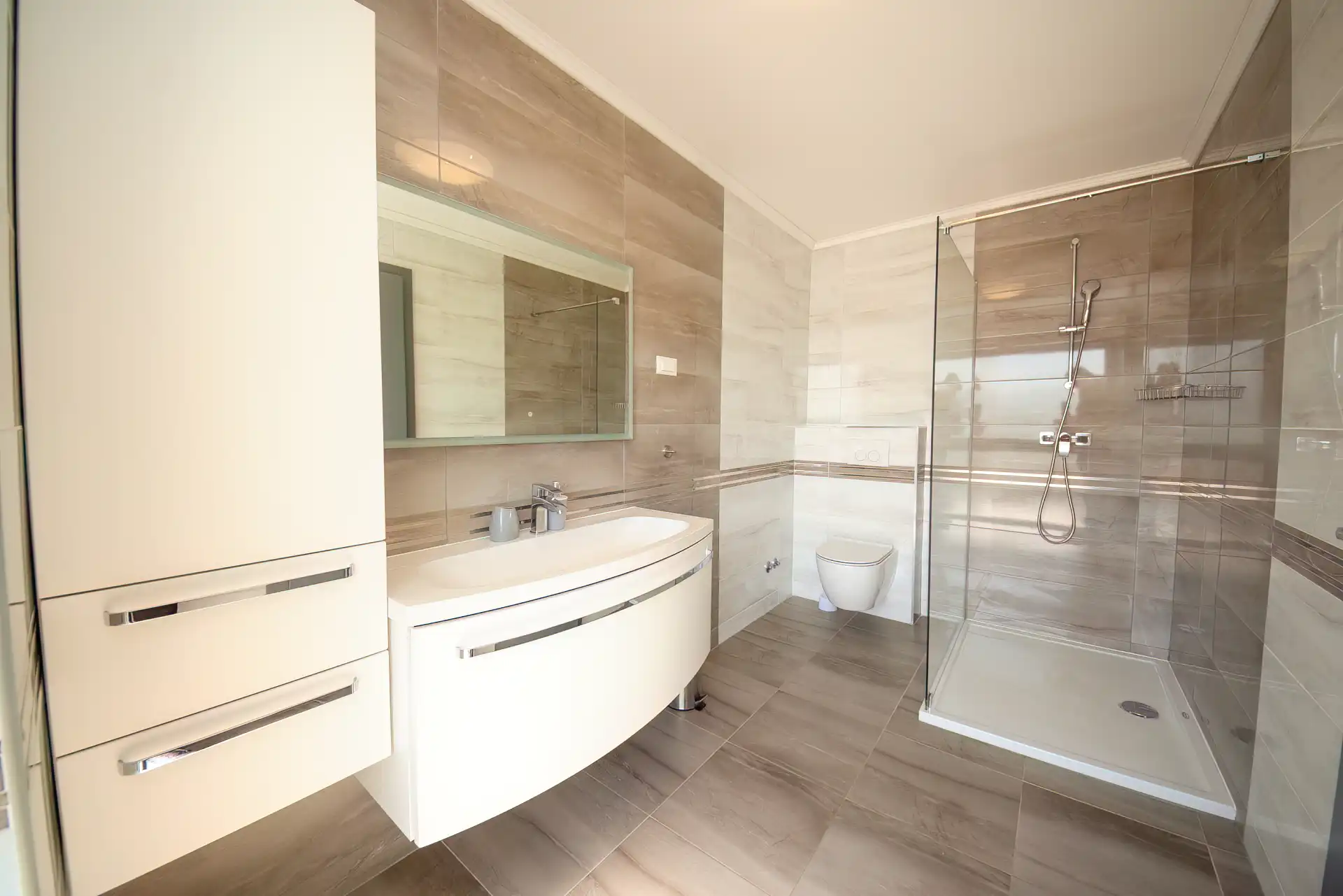Drei identisch ausgestattete 20 m² Schlafzimmer mit jeweils eigenem Bad schaffen private Bereiche für Familienmitglieder oder Freundesgruppen. Jedes Zimmer verfügt über französische Betten (180×200 cm) und individuelle Klimasteuerung.