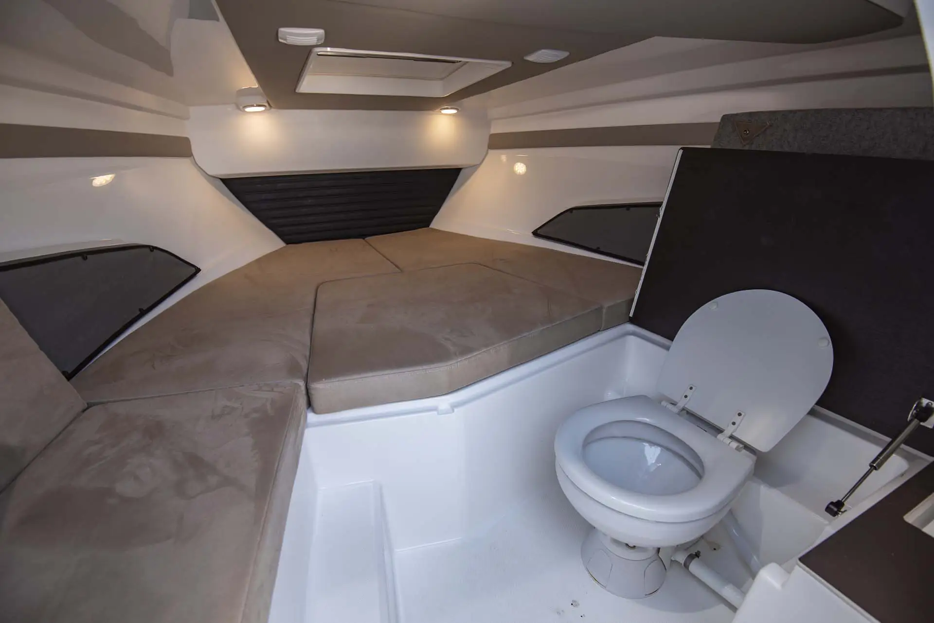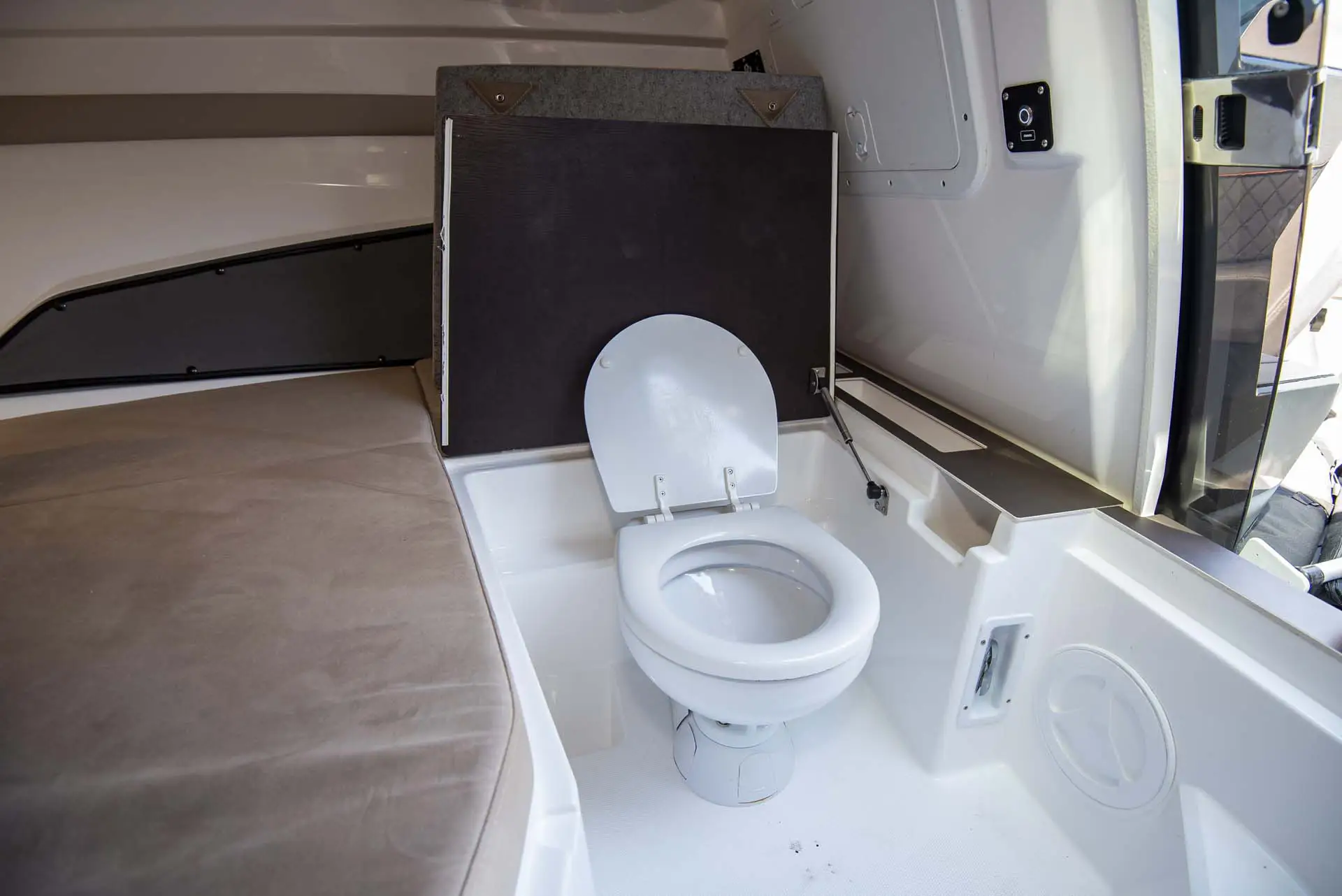WC - Toilette elektrisch, Tisch im Cockpit, Dometic Kompressor Kühlschublade 30l, zusätzliche Sonnenpolster für Liegefläche im Cockpit, temperatur-neutraler und rutschfester Bodenbelag, extra großes Bimini Verdeck mit rundum Beschattung für Sonnen und Sichtschutz, Süßwasser Spüle