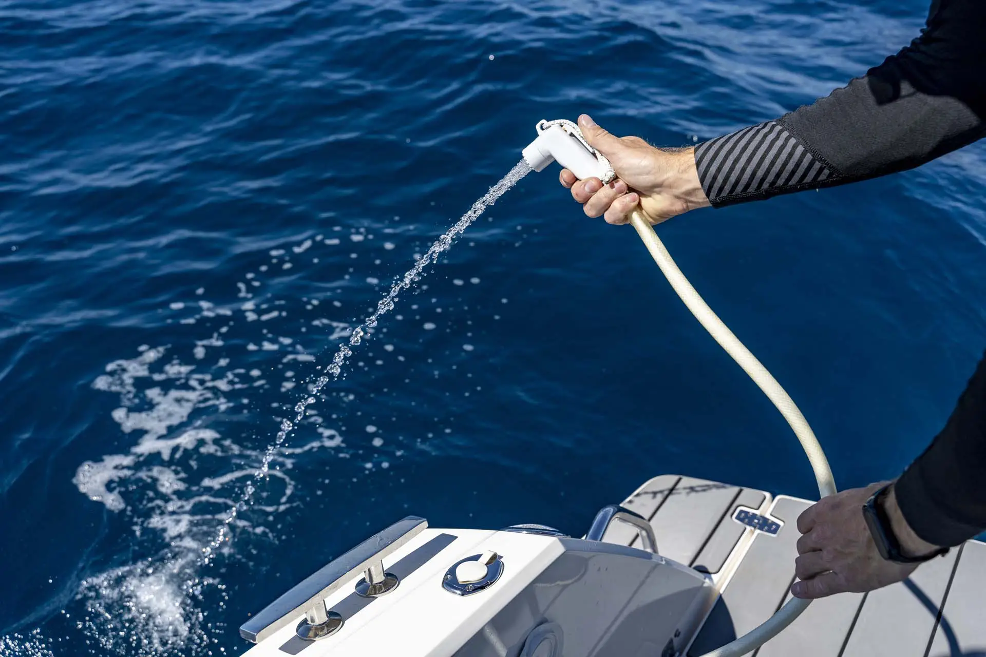 Süßwasser Heckdusche, 8 Fender, Bootshacken, Badeleiter, Sonnenpolster am Bug, zusätzliche Sonnenpolster am Heck auf der Badeplattform