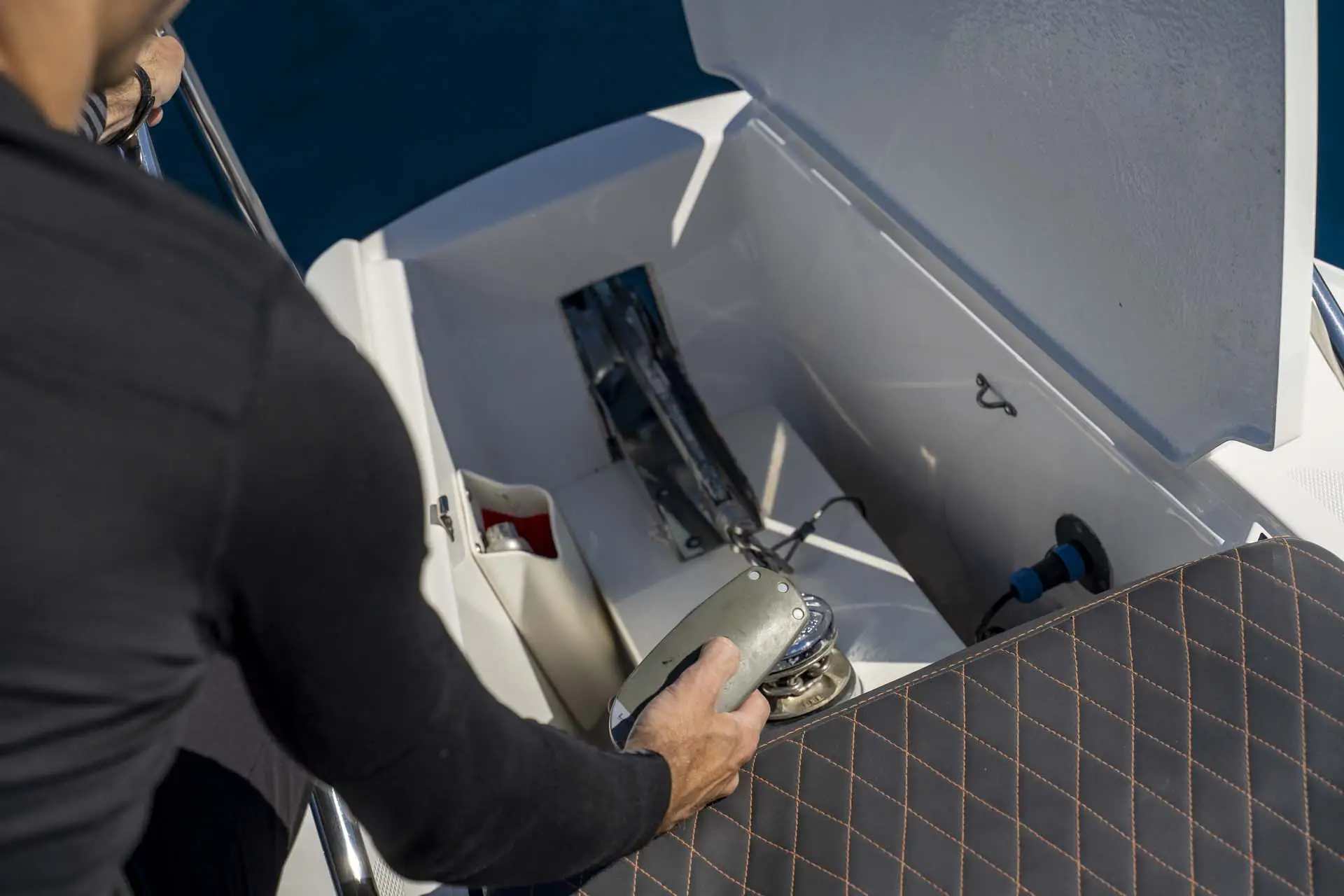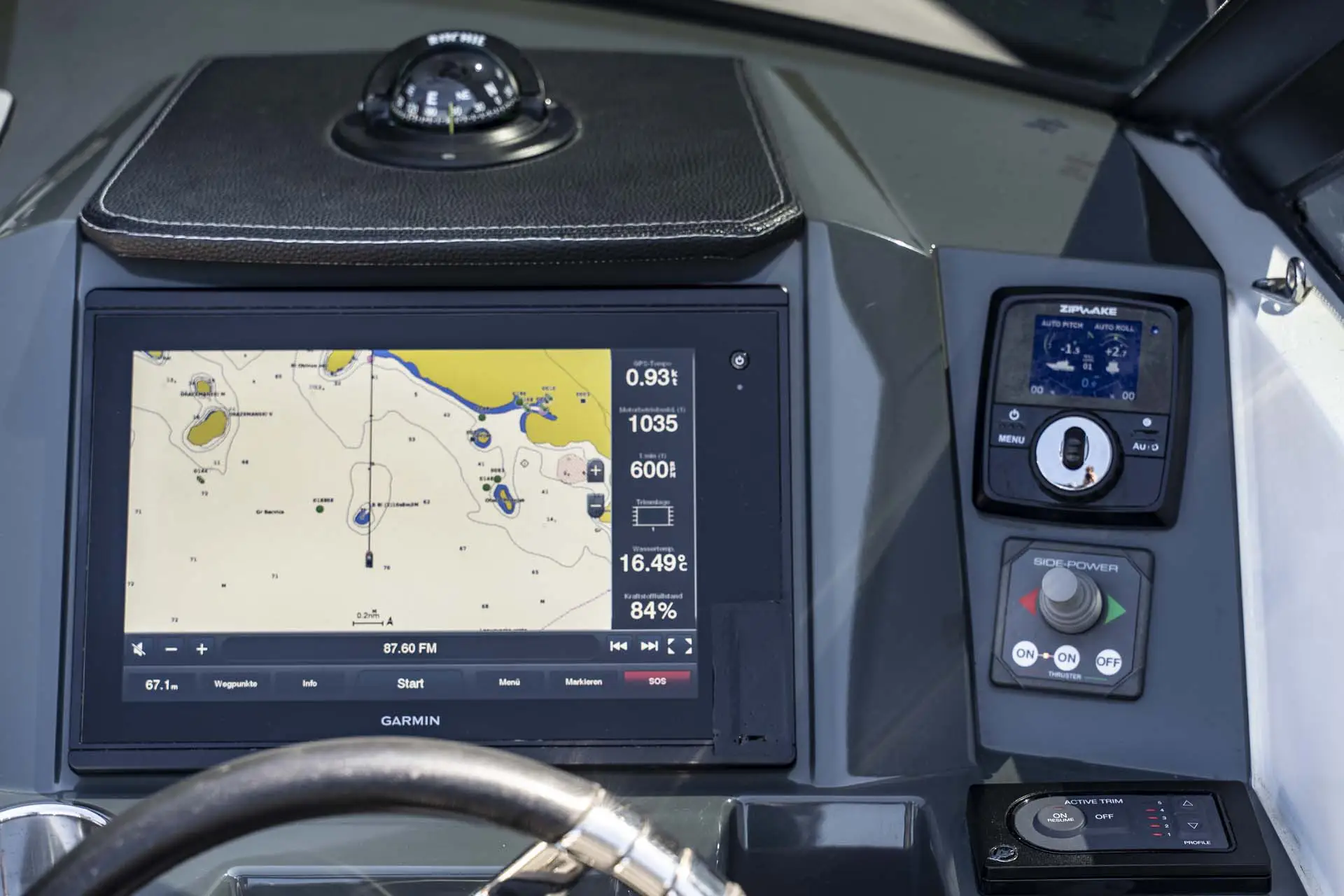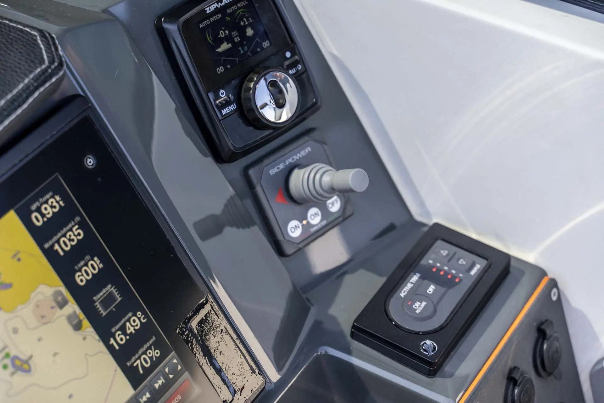 Elektrische Ankerwinde mit Ankerkette 27m, Bugstrahlruder - Bow thruster, ZIPWAKE – dynamische Trimm-Steuerungssystem, Mercury ACTIV TRIMM - GPS basierende Motor Trimmungssystem, zusätzliche Stromversorgung durch Photovoltaik Anlage, Elektrohydraulische Lenkung, Digitales Gas- und Schaltsystem DTS, Druckwasser Anlage, Batterie-Hauptschalter, 2 Batterien Service + Motor