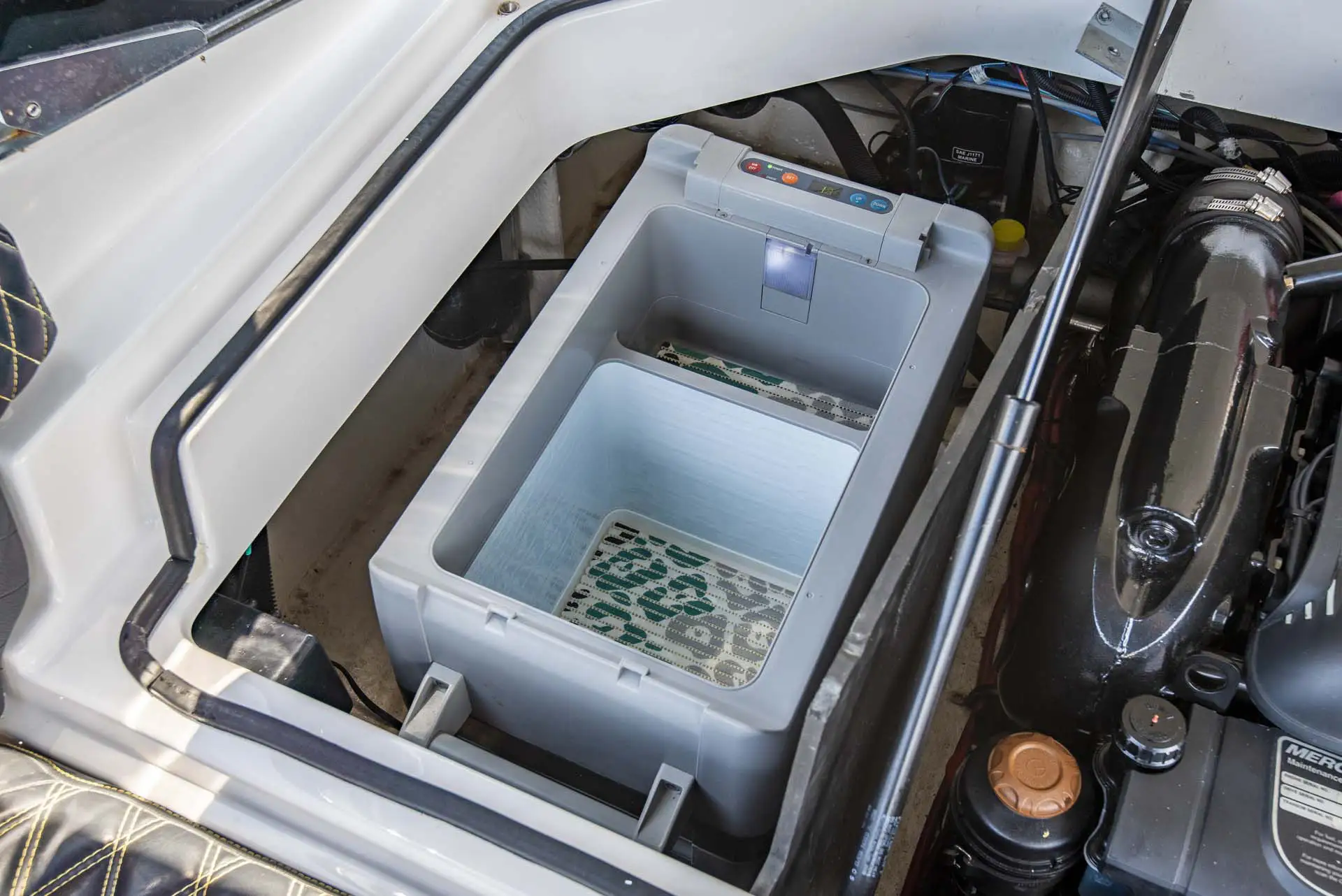 ein großer Waeco Kompressor-Kühlschrank, ebenso eine Heckdusche sowie ein Mercury Activ Trimm – das einzigartige GPS basierende Motor Trimm System.