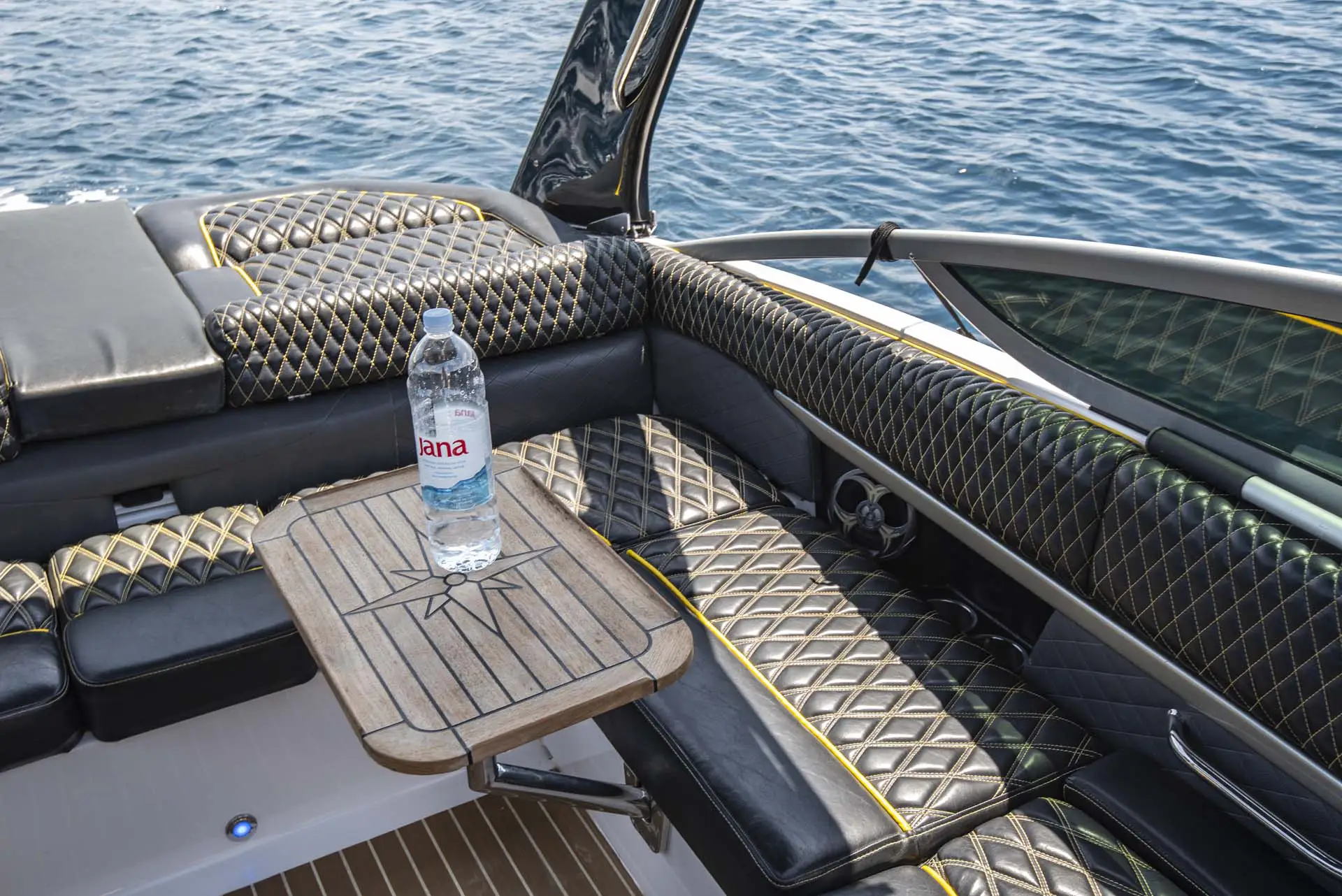 Außerdem ist der der Boden aus rutschfestem Teak der vor allem für sicheren Halt auf dem Boot in allen Situationen sorgt.
