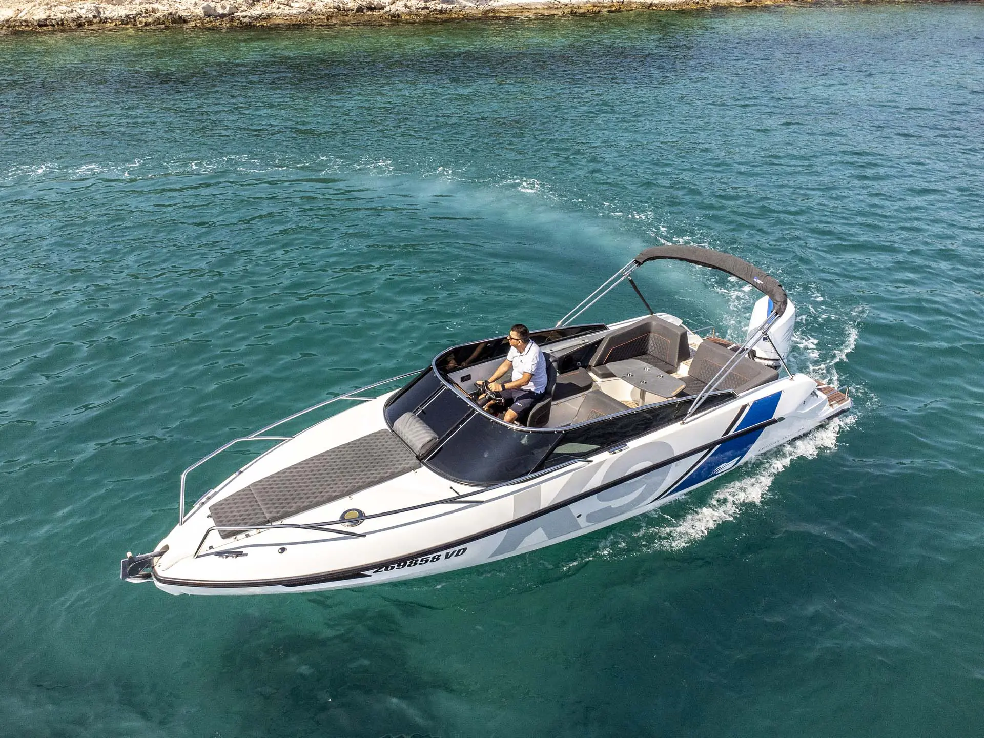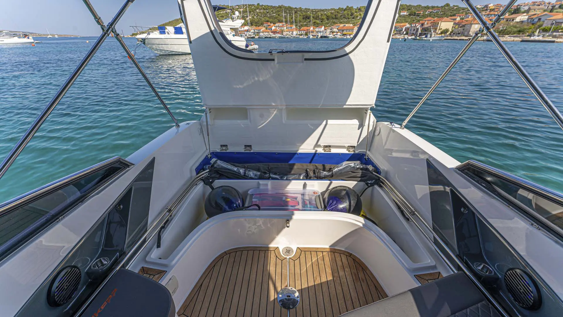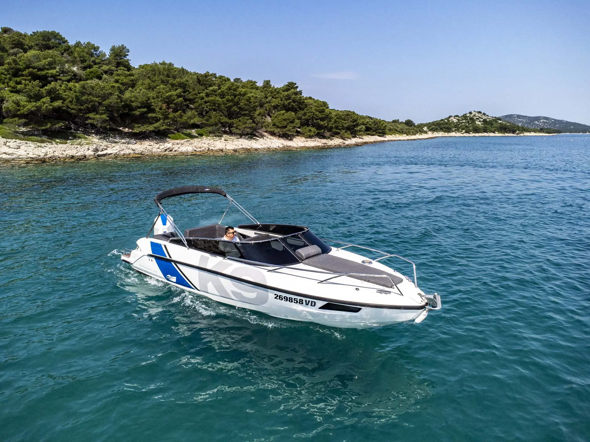 Schon „von der Stange“ ist dieses Boot allerhöchste Klasse, doch damit nicht genug: Tuning by Kristijan Antic bedeutet höchsten Komfort für Charterkunden! Ein größeres Bimini Verdeck (Sonnendach) und der neu entwickelte Mercury V8 mit 300 PS, der von Kristijan Antic noch optimiert wurde, sind nur zwei der zahlreichen Modifikationen.
